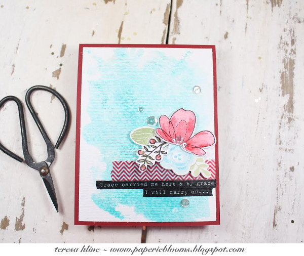 good day friends, I hope you were able to craft a bit this weekend for world card making day...me not so much...working all weekend. I am luvin the sunday stamp colors this week, aquas and red are stunning together. I have used a watercolor splash background and then added an array of other elements. A simon says stamp flower, paired with other random flowers and leaves from my box of unused items. I piece of washi, a washi sentiment, and clear sequins bring it all together. I can't wait to see what you create!